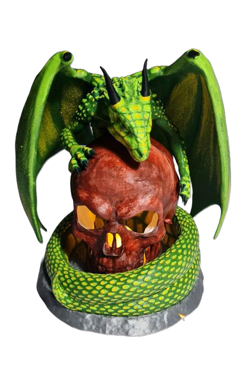 Un temible dragón agarrando una calavera, proyectando un resplandor siniestro por toda la habitación. Perfecto para crear la atmósfera perfecta de terror.